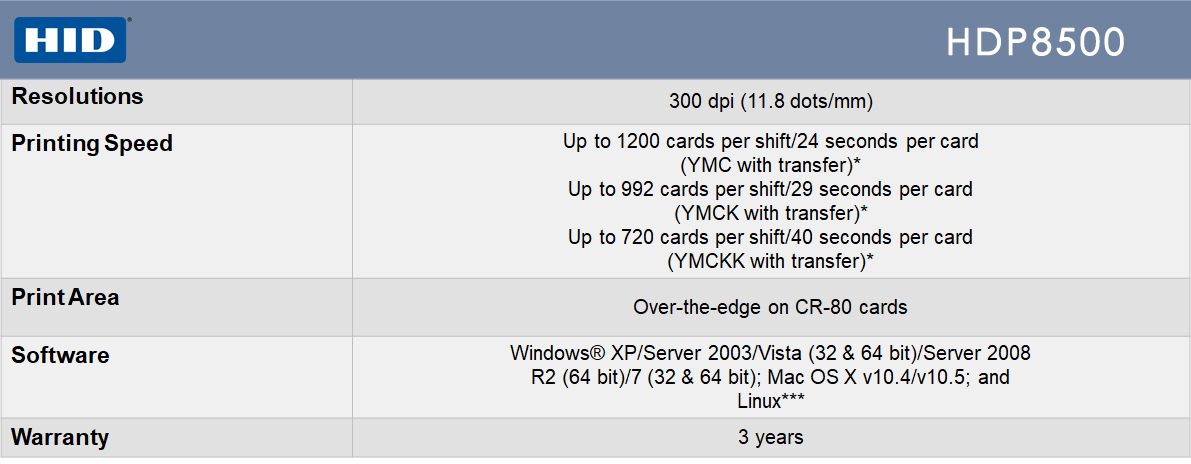 HID® Fargo® HDP8500 Specification![]() HID® Fargo® HDP8500 Features