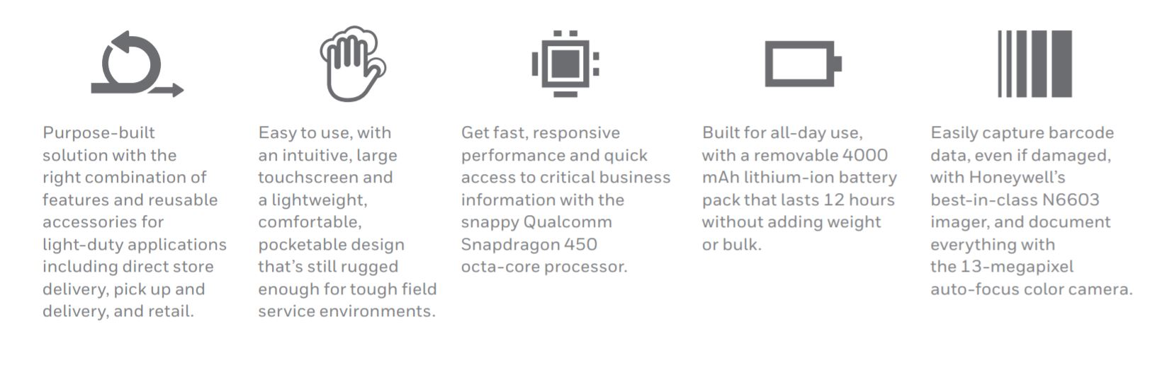 Honeywell ScanPal EDA51Mobile Computercombination of integrated scanning, powerful processing, intuitive touchscreen interface, and robust connectivity in a rugged, slim ergonomic design. retail, DSD, pickup and delivery, and field service applications. combination of features and reusable accessories to drive productivity in light duty retail, delivery, and field service applications. |