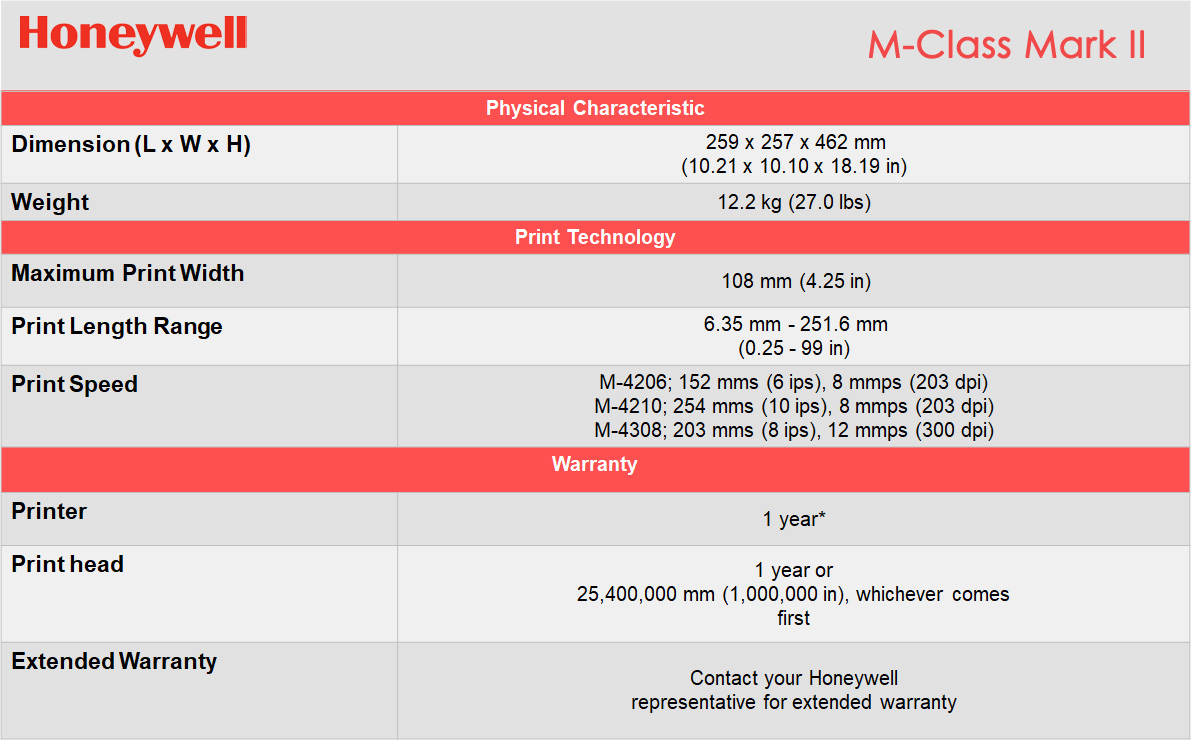 Honeywell M-Class™ Mark IICompact Industrial Printersfor a wide variety of industries and applications that require a reliable and cost- effective barcode printer. components and offers a broad range of connectivity to meet diverse application requirements and easily integrates into most networks. connectivity, emulation support and options, including RFID support. |