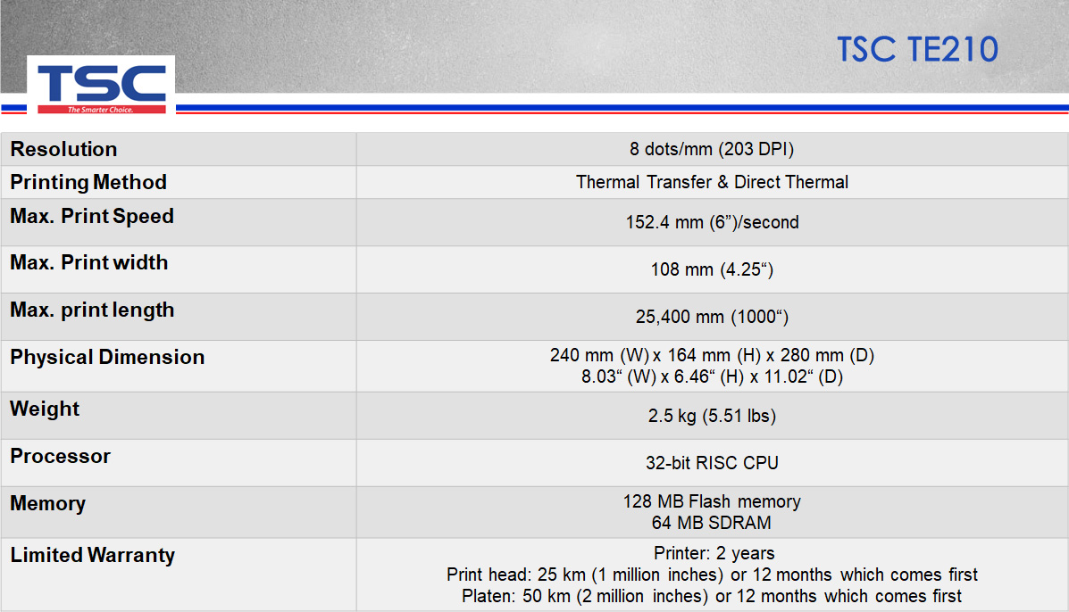 The TE200 Series provides customers throughout the world with a competitive, durable, entry-level desktop printer that is both versatile and easy-to-use. The new TE200 Series of 4" wide desktop-class thermal label printers were designed and built to deliver best in-class performance.