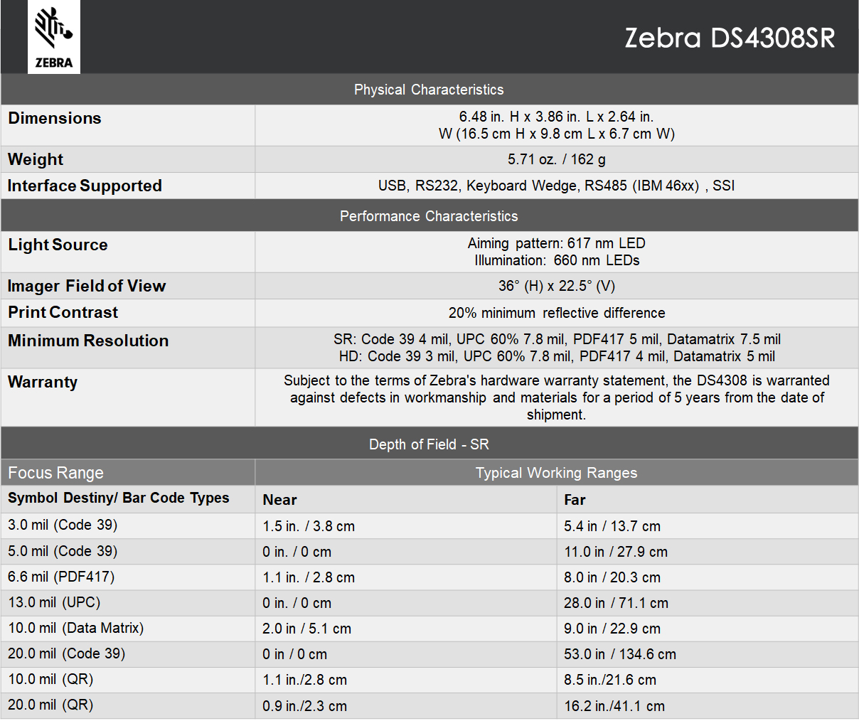 Zebra DS4308SR Handheld Scanner Specification