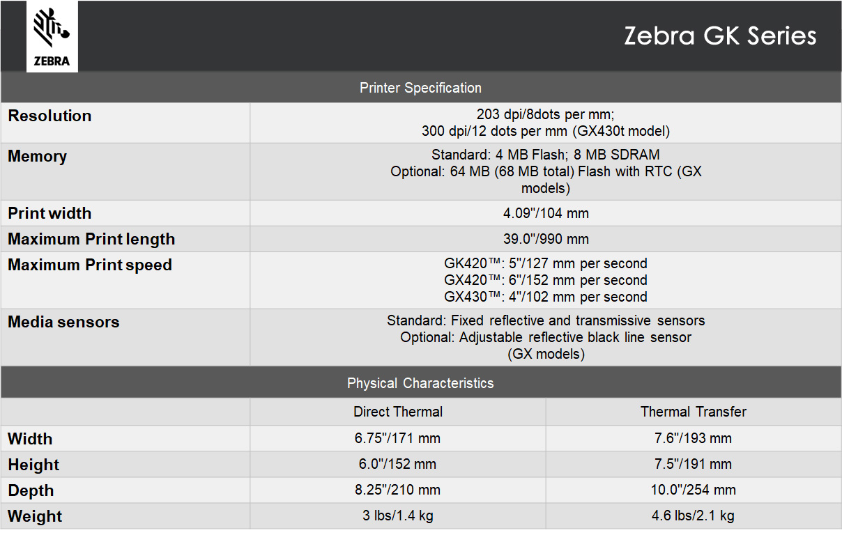 Zebra GK Series Printer Specification