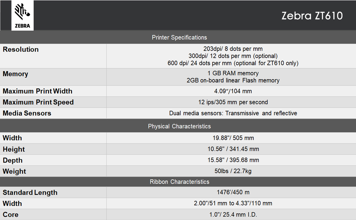 Zebra ZT610™ Industrial Printer Specification